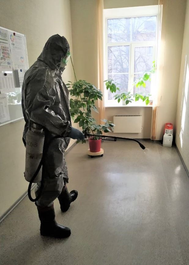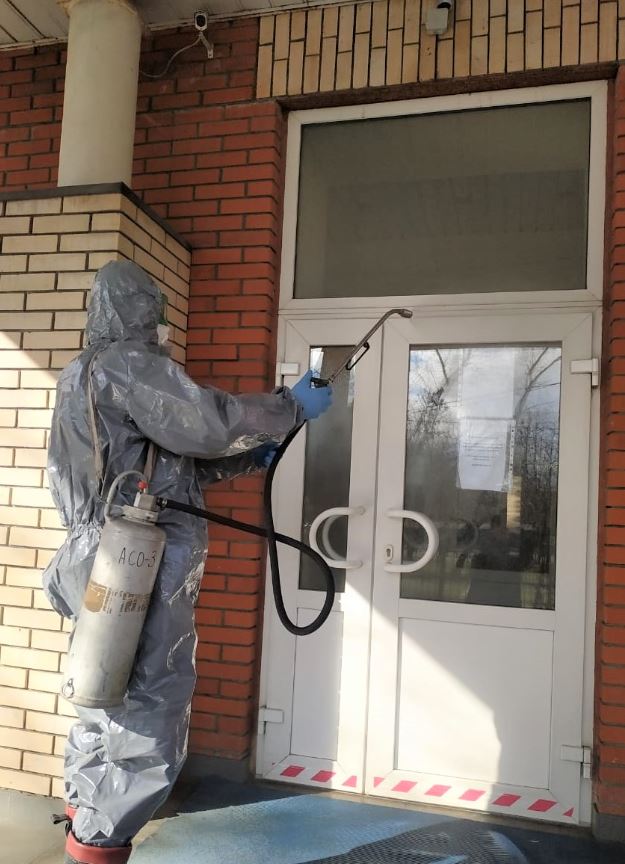 Внутри здания дезинфекцию проводили сотрудники Аварийно-спасательного отряда №3 ГКУ ПСЦ. Перед началом работы спасатели ещё раз проверили свою экипировку – защитные костюмы, очки, маски, перчатки. Убедившись, что нарушений в защитной одежде нет, они прошли с распылительными агрегатами по всем помещениям Управления, начиная со входа в здание и заканчивая верхним этажом. Заглянули во все кабинеты и подсобные помещения. Обработали стены, потолки, полы, лестницы и перила, двери и дверные ручки. Вирус после обработки раствором погибает в течении трёх часов. Для людей и животных дезинфицирующее средство безопасно.