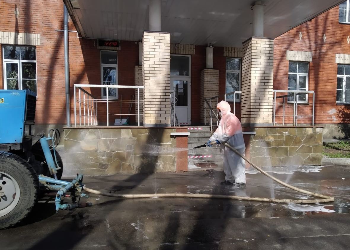 А на улице здание Управления обработали сотрудники ГБУ «Жилищник района Лианозово» – стены, окна, крыльцо и ручки на входных дверях, хозяйственные постройки на территории Управления, газоны и дорожки, деревья. Работники «Жилищника» для обработки использовали трактор в бак которого было залито средство, которое и вирус уничтожит и дорожки помоет.