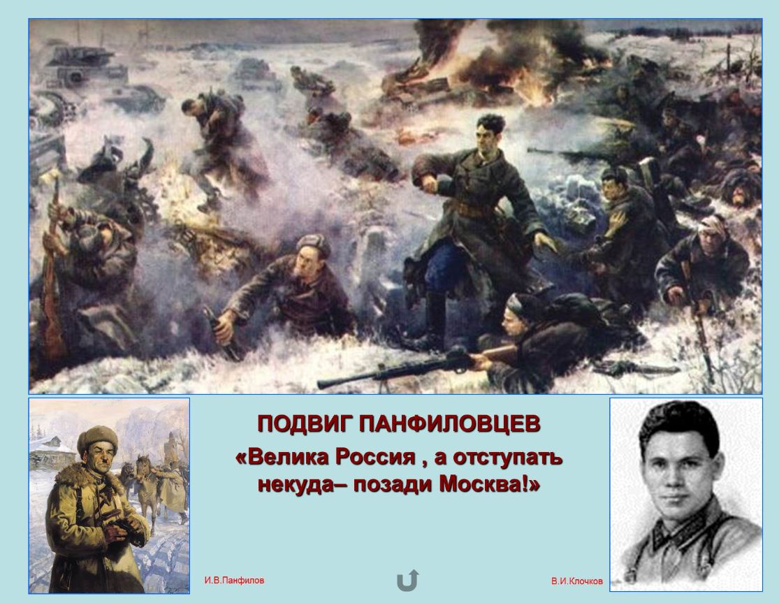 Панфиловцам приходилось выскакивать из траншей, чтобы вручную бросать связки гранат или «коктейли Молотова». После подобной вылазки солдаты чаще всего гибли на месте. Как раз во время подобного маневра погиб политрук панфиловцев Василий Клочков, которому принадлежат слова: - «Велика Россия, а отступать некуда - позади Москва!». (Сейчас в районе Кунцево г. Москвы есть улица, названная его именем)